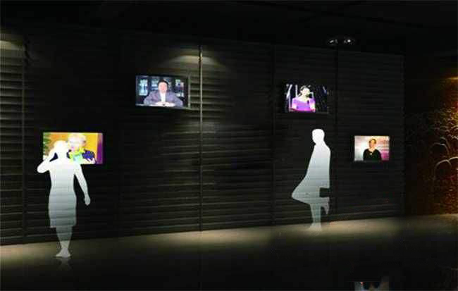 觀眾看到墻面上多個顯示設(shè)備中,每個顯示畫面中都有人物的視頻靜止影像。每臺電視下都有一個控制按鈕(可以是自動感應器),當觀眾按到其中一個時(當自動感應器撲捉有人接近 ……